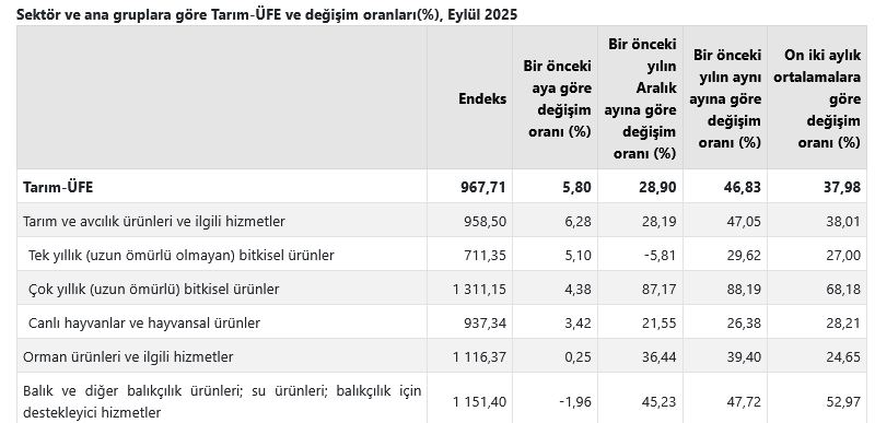 Türkiye İstatistik Kurumu (TÜİK), Eylül 2025’e ait Tarım Ürünleri Üretici Fiyat Endeksi (Tarım-ÜFE) verilerini açıkladı. Tarım ürünlerinin üretici fiyatları, geçen yılın aynı ayına göre yüzde 46,83, bir önceki aya göre ise yüzde 5,80 oranında arttı.